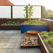 Cortenstahl, auch als witterungsbeständiger Stahl bekannt, wurde speziell für den Einsatz im Außenbereich entwickelt. Unter dem Einfluss von Regen, Sauerstoff und Temperaturschwankungen bildet sich eine schützende Rostschicht, die dem Material eine warme, natürliche Ausstrahlung verleiht und weitere Korrosion verhindert.