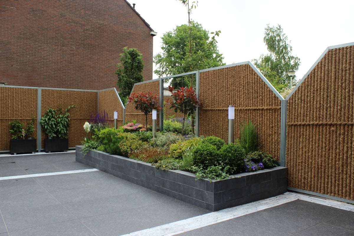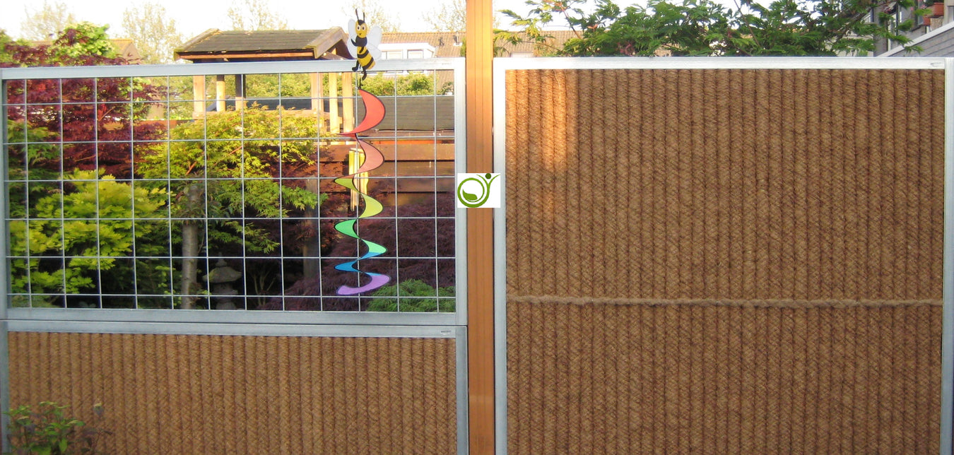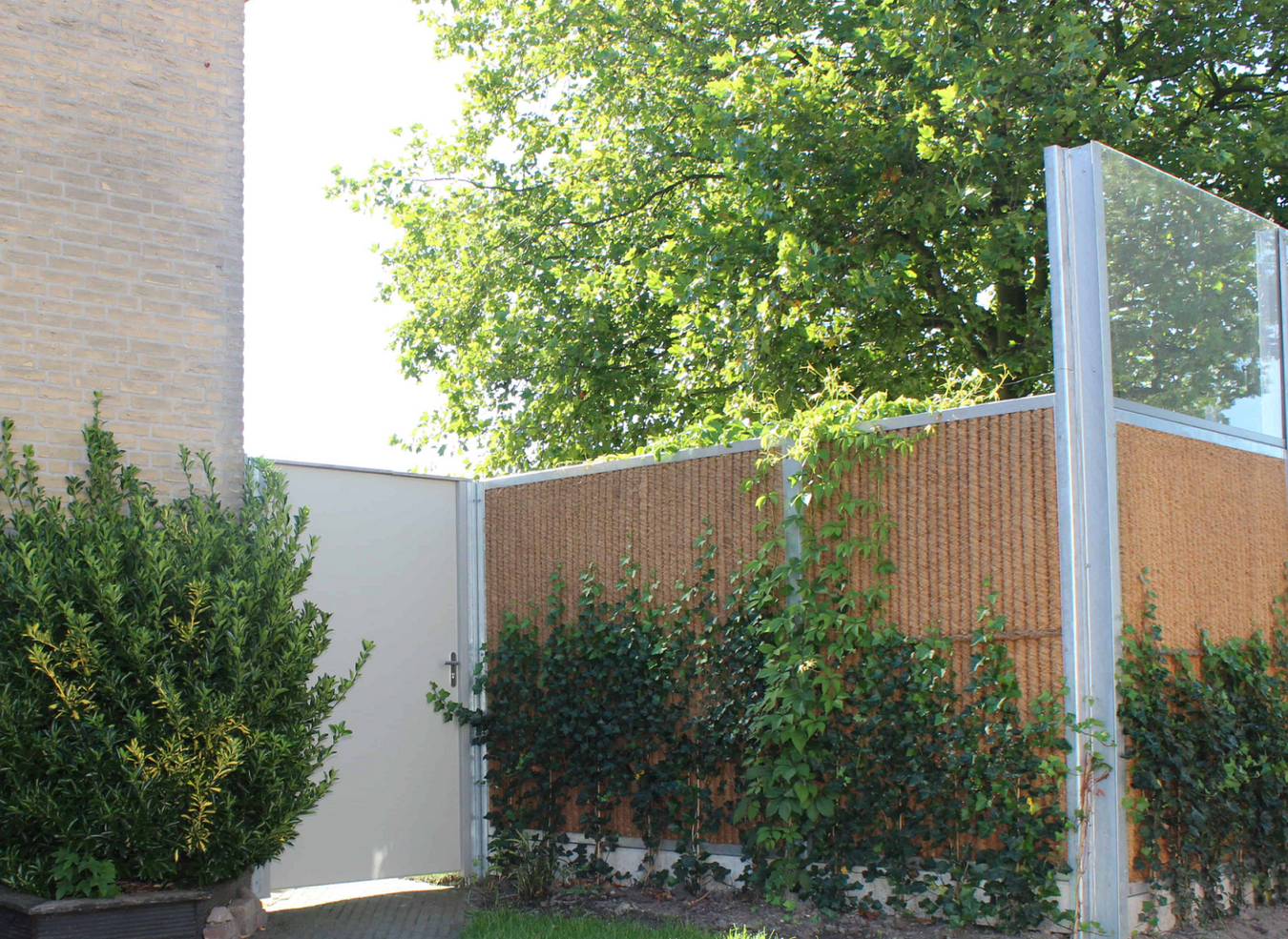 Kokowall tuinscherm in combinatie met gaaspaneel en hardhouten paal